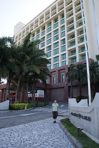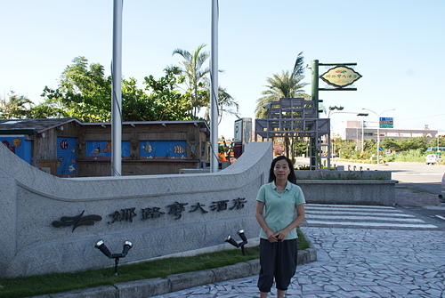 空檔在大廳與一艘蘭嶼獨木舟和原住民木雕人像合照,也到戶外拍娜路彎大酒店建築物外觀。