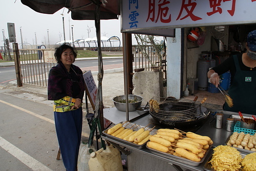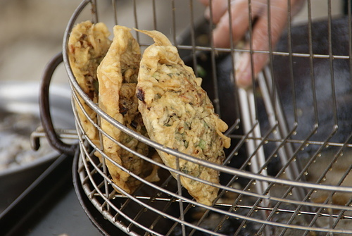 生平第二次到竹圍漁港逛,看到停車場旁的攤販賣脆皮蚵嗲,被冷冷的海風吹襲之下,便想吃點熱呼呼的點心,就點一份現炸嚐嚐。