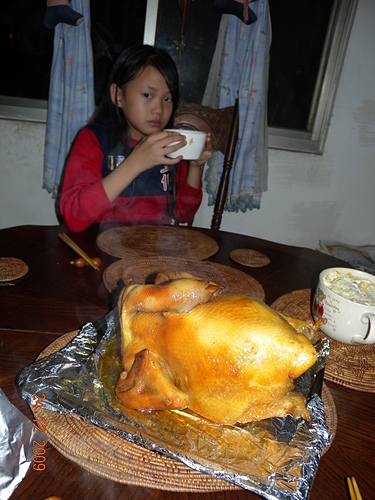 小女兒覺得很稀奇,因為她不曾看過我家餐桌上擺過一整隻烤雞。