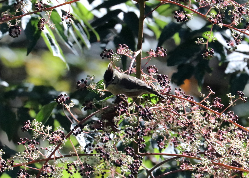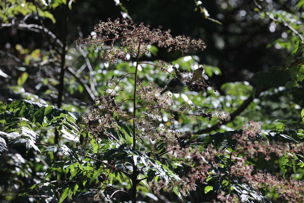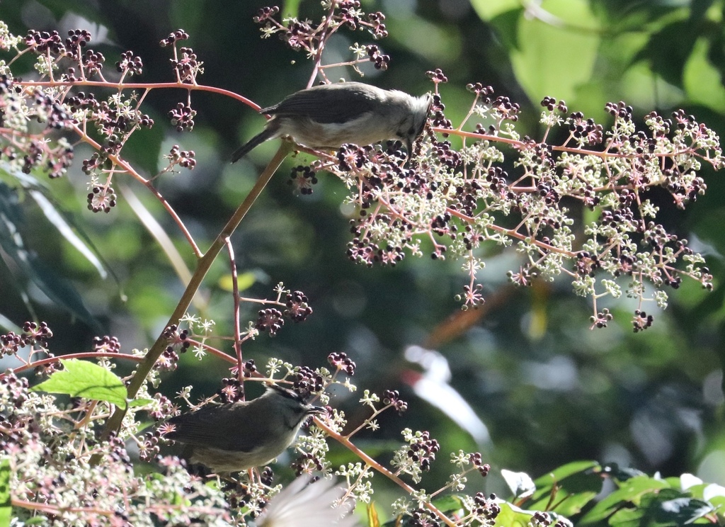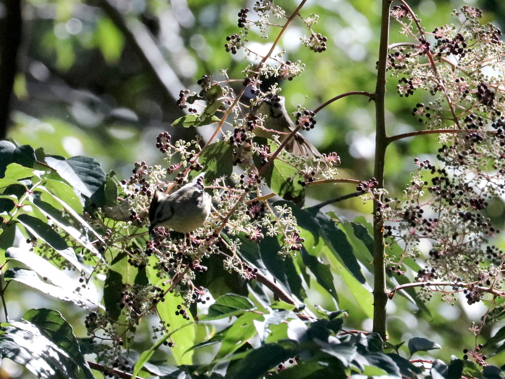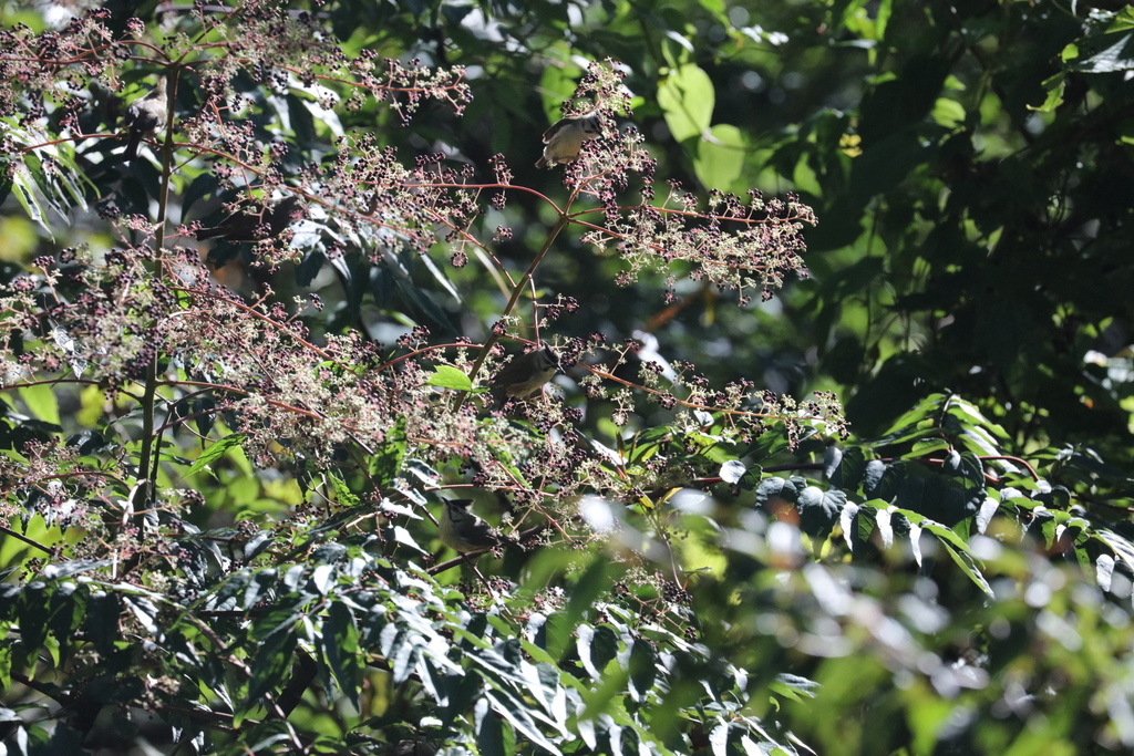 冠羽畫眉一群在大雪山林道的裡白楤木紫黑色漿果中活潑地飛來飛去,時而啄食,時而鳴唱,好不熱鬧~!