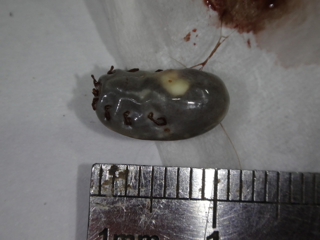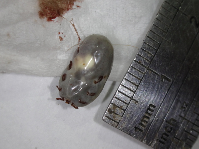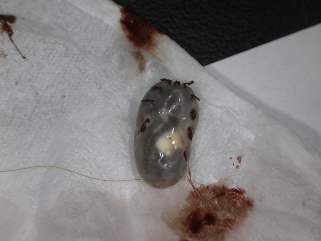 104.9.3/5 在愛犬身體左大腿處和脖子二個地方,發現各有二個灰色蟲子在吸牠的血...。