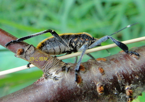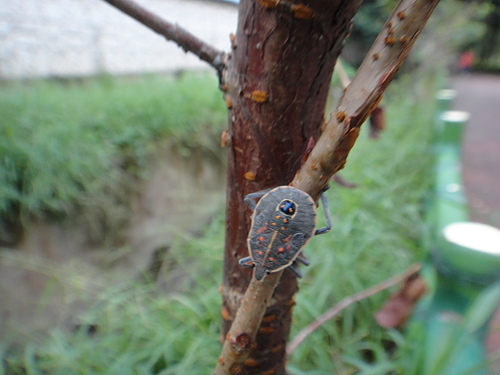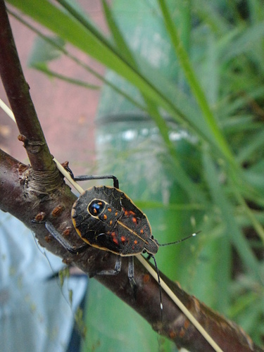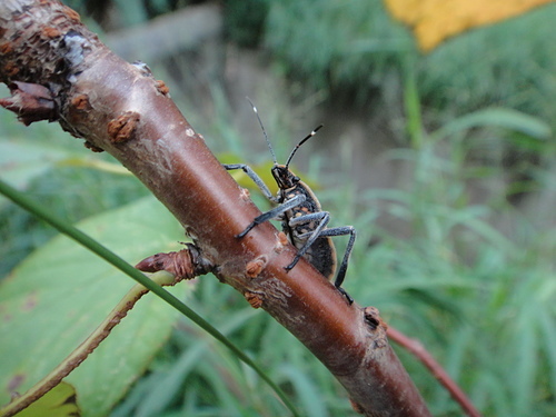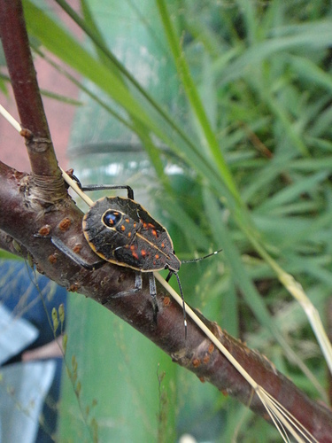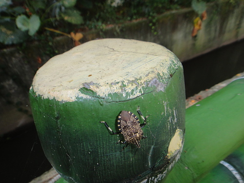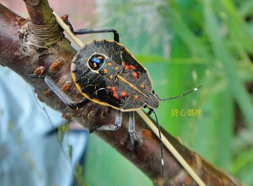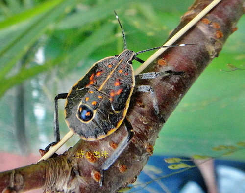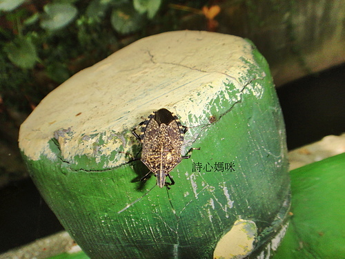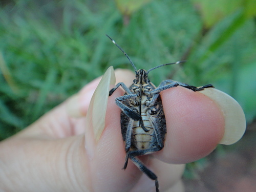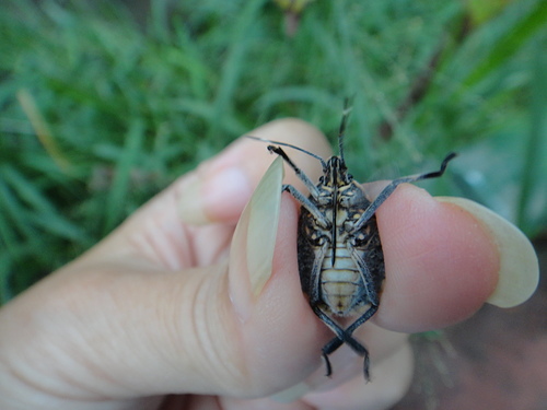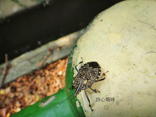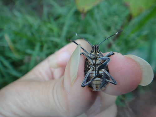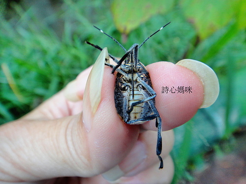 抓住黃斑椿象終齡若蟲欲拍其腹部,誰知牠竟然釋出臭液,不但將我的二隻手指弄濕,