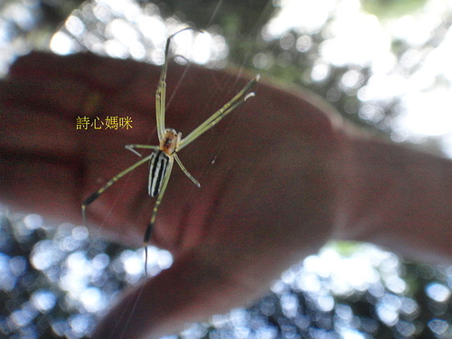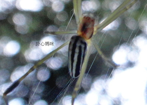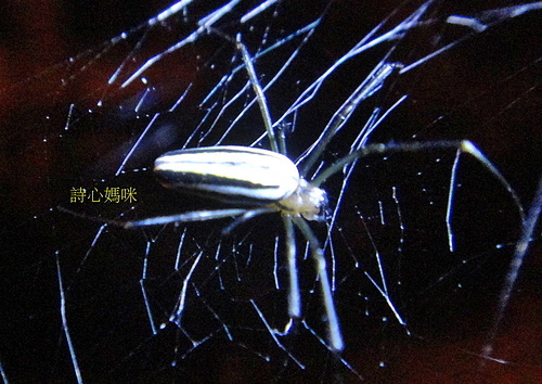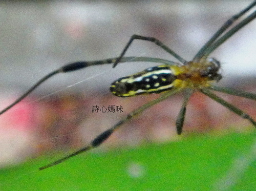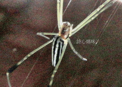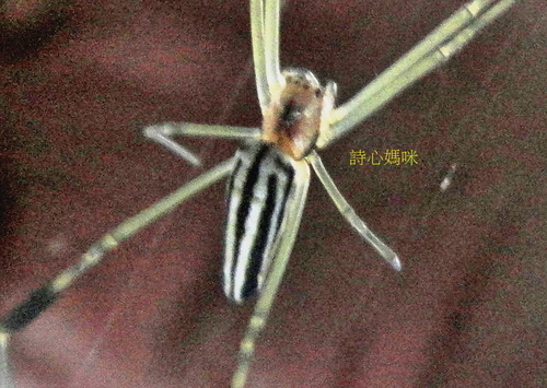 在水圳欄杆上看到一隻長腳蛛,背部條紋是 黑色,不似大銀腹蛛~?