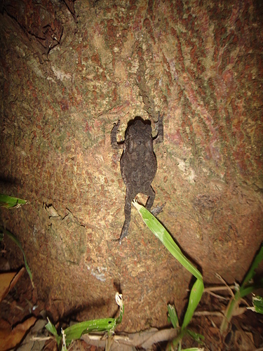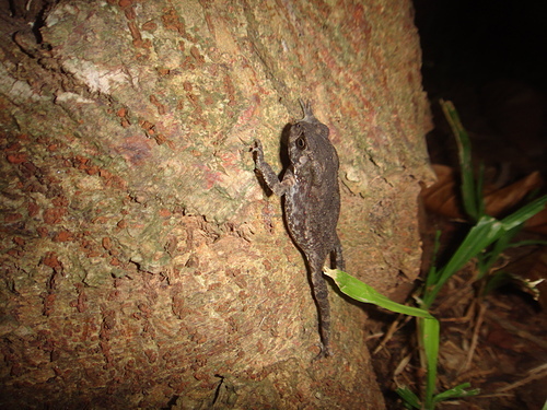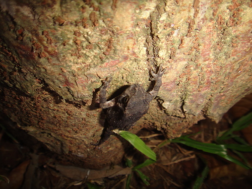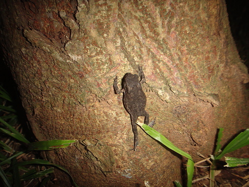 晚上至公園夜觀,一隻黑框蟾蜍幼蛙被外子驚嚇,一躍而上跳至構樹幹上,便一動也不動地趴著,姿勢頗怪異~!