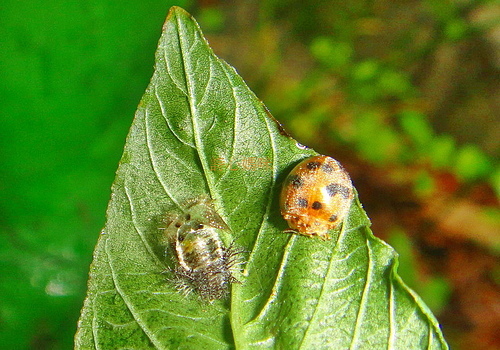 忘記去觀察三隻茄二十八星瓢蟲幼蟲的化蛹期,今天清晨7:31冒雨前去看時,一隻已羽化,一隻仍在蛹殼內休息,一隻仍是蛹。