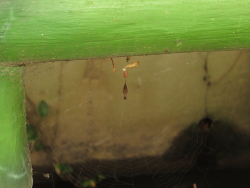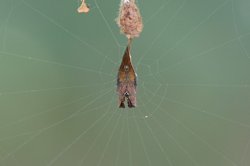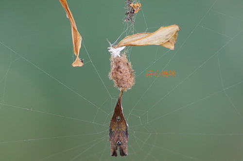 這隻灰黃色的黑尾曳尾蛛雌蛛,在102.2.28來此水圳欄杆定居後,12天後第一次產下褐色卵囊。