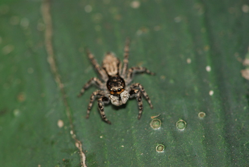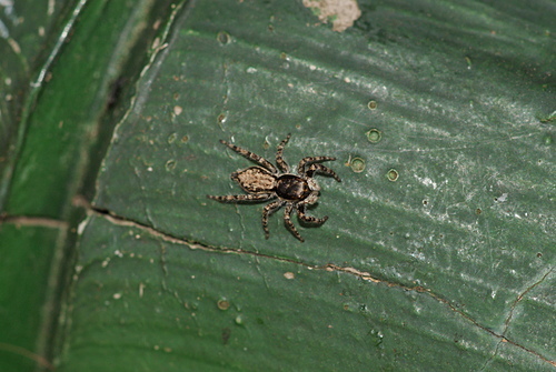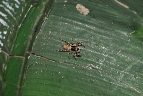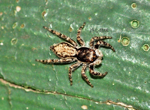 黑頭的雙帶扁蠅虎 (雌) 補食棘腹金姬蛛