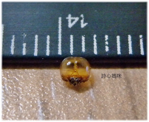 長約12mm,頭(胸?)寬4mm,身體寬不到2mm;高約4mm。