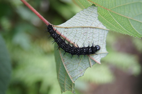 終齡幼蟲體呈長圓筒狀,各體節背方著生數枚棘狀突起。頭部褐色,表面密生多數細毛,頭縫線有時呈黑或深褐色。體呈黑色,體表各體節背方著生黑色棘狀突起,各體節背方中央背線兩側及氣門下線部位有數枚白斑,體側氣門為黑褐色。