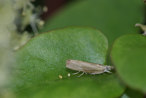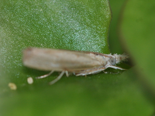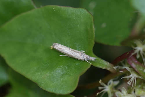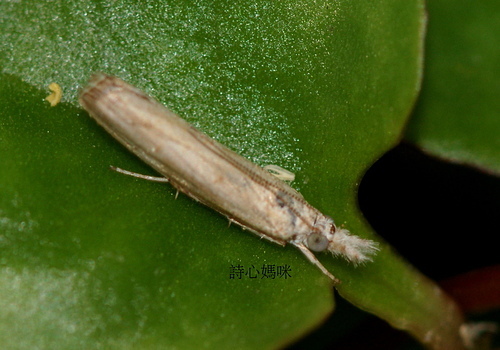 銀色 草螟蛾 - 身體筒狀長條, 頭有二束短毛