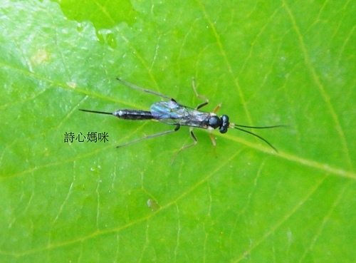 蛛蜂 (灰黑色) 雌成蟲的腹尾有根細長的產卵管