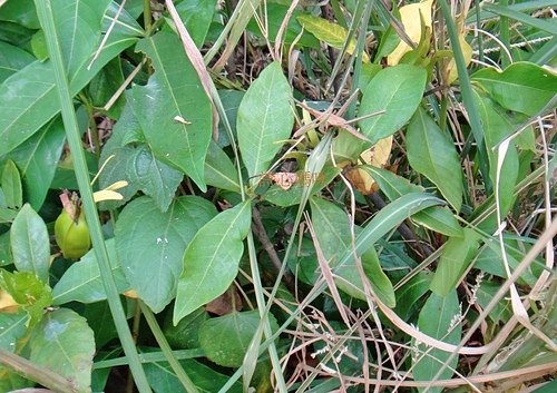褐色斑紋的二隻中華劍角蝗若蟲,似乾涸的野草,在山黃梔叢中不易辨認~