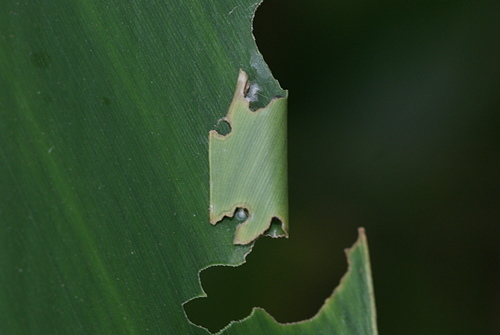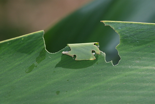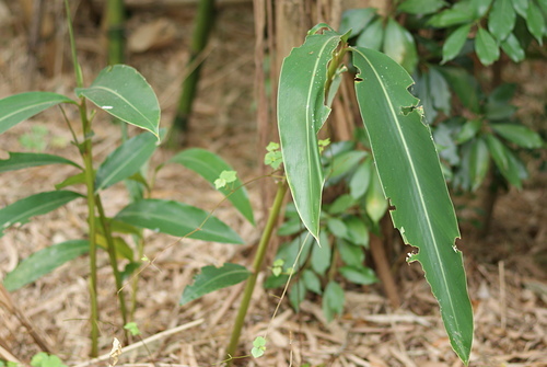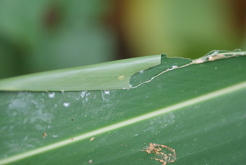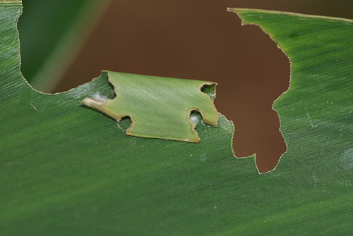 在不同植株的月桃葉片上,觀察到二隻似乎同齡期的薑弄蝶(大白紋弄蝶)幼蟲。