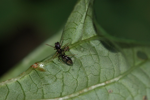 黑色蟻蛛 (雌)補食 98.5.27 攝於 大稻田水圳散步道 杜鵑花