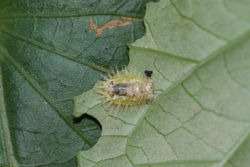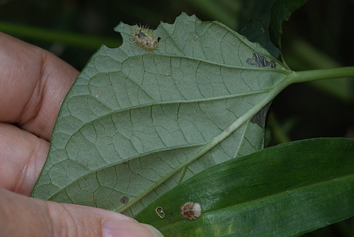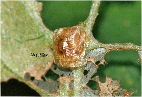 同一株的槭葉牽牛花葉片上發現不知名龜金花蟲的卵鞘/幼蟲/空蛹殻?