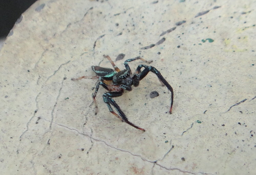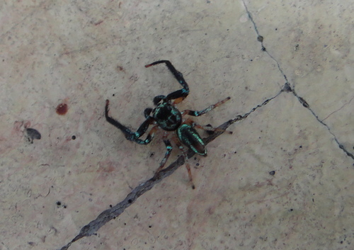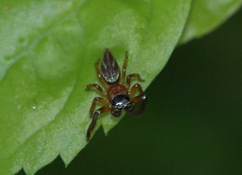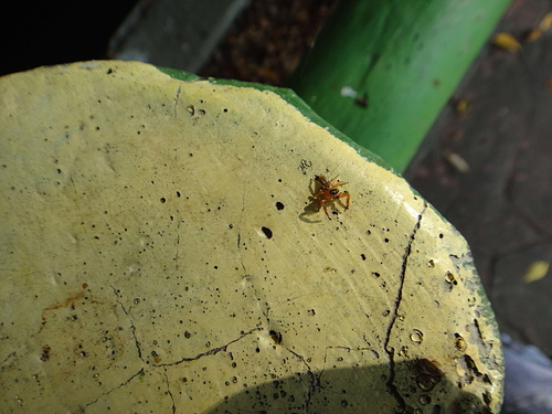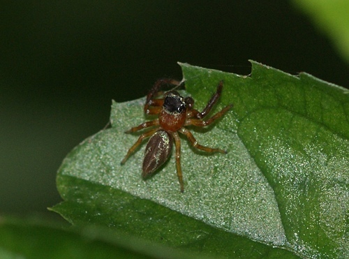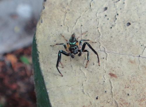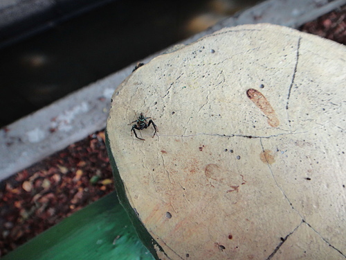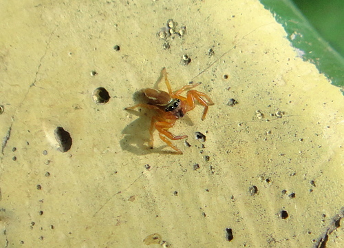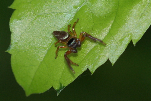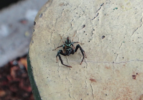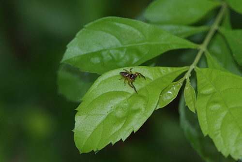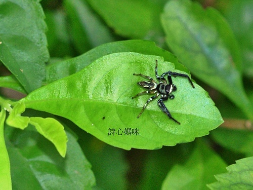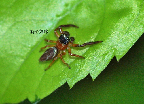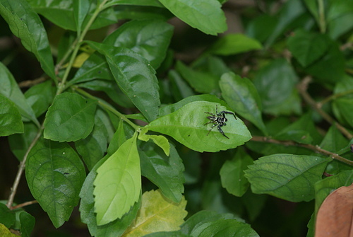 在社區小公園金露花叢中,發現二隻體色不同的雄細齒方胸蛛,善於跳躍。