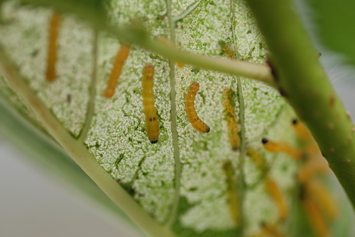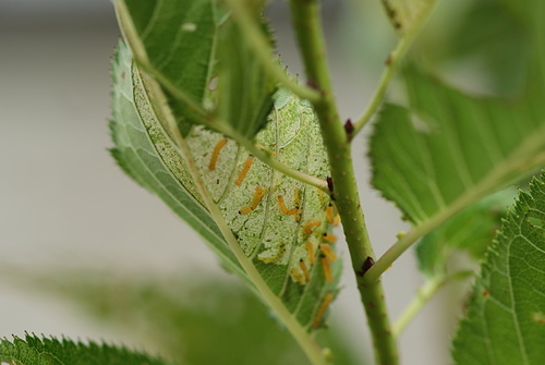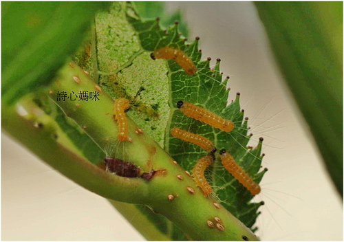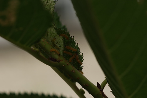 同一株山櫻花葉片上有二種顏色的梨偽毒蛾寶寶: