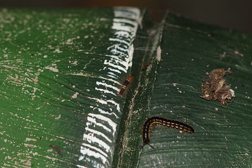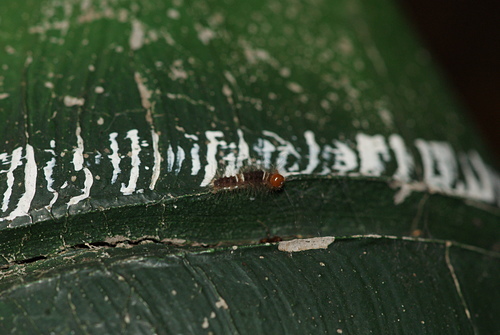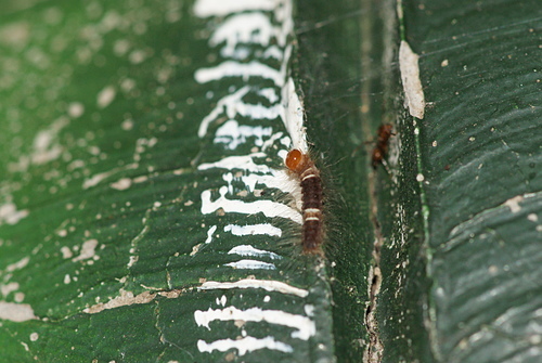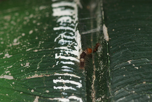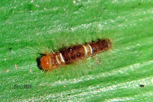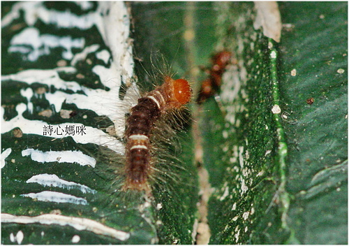 一隻全身長毛的蛾寶寶-- 橘紅頭、身體棕色、具四條白環紋。