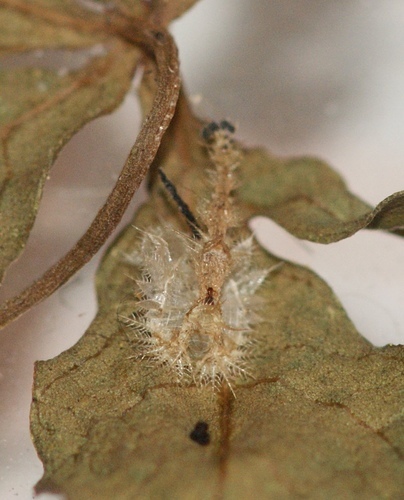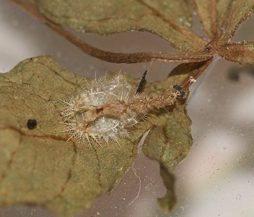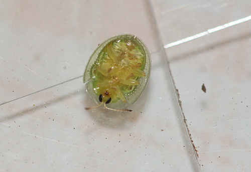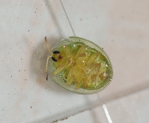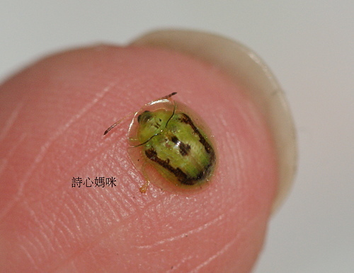 反倒是無心插柳柳成蔭,槭葉牽牛花葉片有夾帶一隻甘藷龜金花蟲幼蟲,卻順利長大化蛹至羽化。
