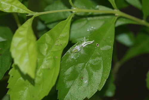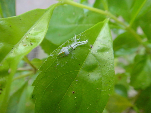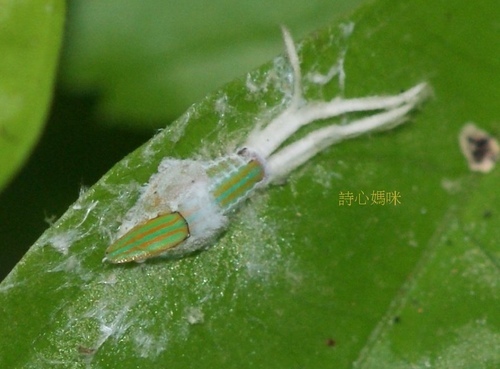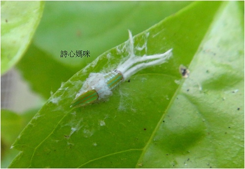 若蟲體綠,胸背無蠟絮,有4 條紅褐色縱紋,腹背佈白色蠟絮,腹末有2 束白絹狀長蠟絲。