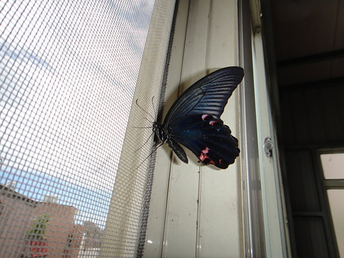 我平常難得上頂樓,這天早上小女兒幫母嬌犬 Yuni 洗澡,我上頂樓拿晾乾的寵物擦澡巾,遠遠就看到紗門停留一隻鳳蝶。