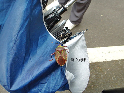 全家人甫自陽明山公園,開車來到紗帽山登山口,長女的深藍洋傘便吸引一隻台灣大椿象停留。