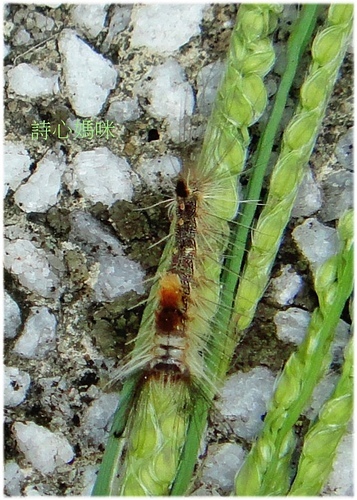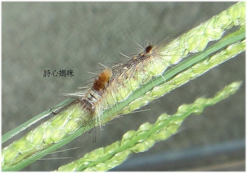 身體褐黃色斑紋密佈,頭部有一簇簇黑毛與白毛鬚,胸部有三團褐紅黃短圓毛~