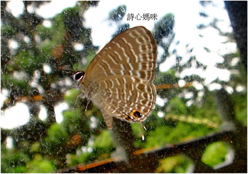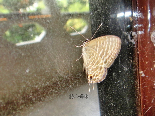 一隻埔里波紋小灰蝶,誤飛進陽明山辛亥光復樓的藝品販賣部,一直在玻璃窗打轉,嚮往飛向戶外的自由空間。