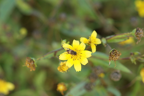 斑眼食蚜蠅忙於小油菊花朵間採蜜。