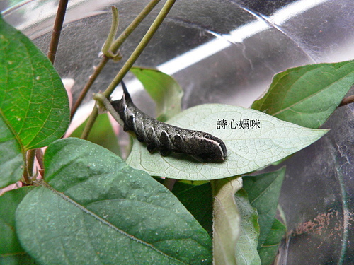 曾將幼蟲照片放到「自然攝影中心」請求確認,然對回覆為“三角凹緣天蛾終齡幼蟲”有疑惑。