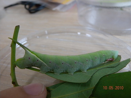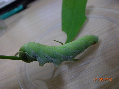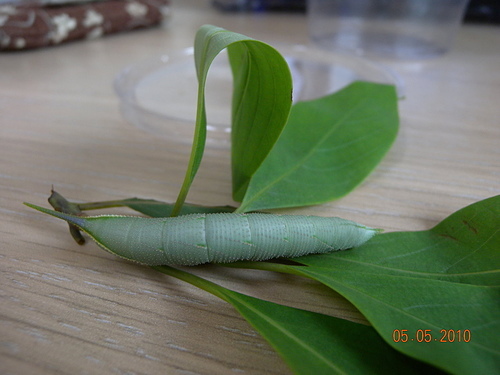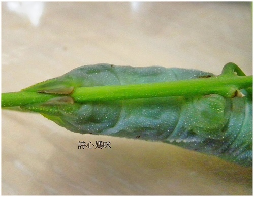 長女以食草香楠飼養楠六點天蛾幼蟲,牠永遠保持少女祈禱的姿勢,似乎很害羞~。