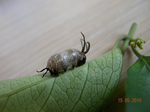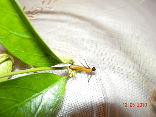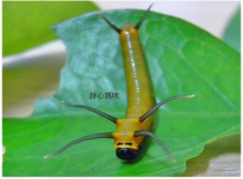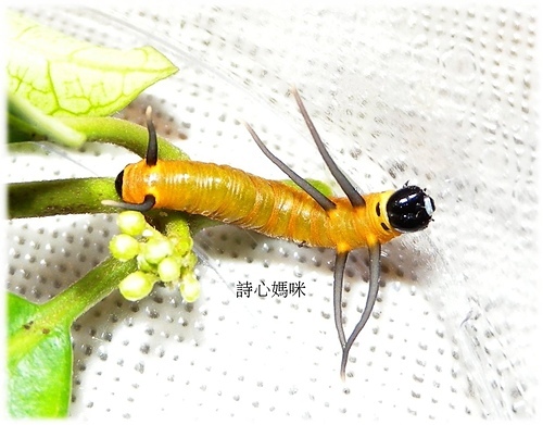 早齡幼蟲頭部黑色,終齡幼蟲頭部具白色的八字紋,體色橙黃色,中、後胸及第 8 腹節背方有細長肉質突起 。