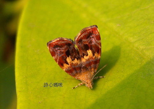 前翅為紅褐色底,有多條銀藍色線條,近基部1/3處有一條黃色波狀帶;後翅為黑褐色,無其他翅紋。