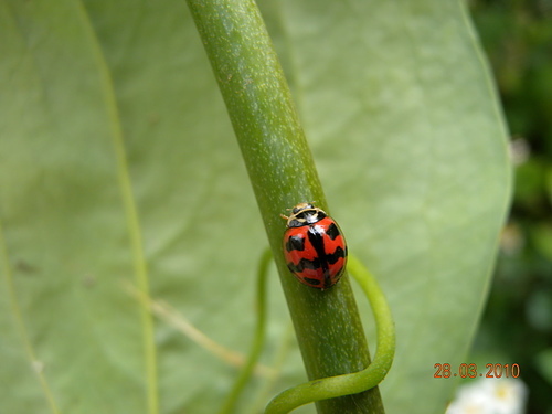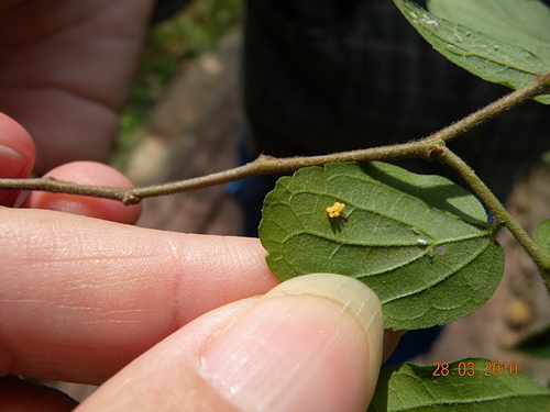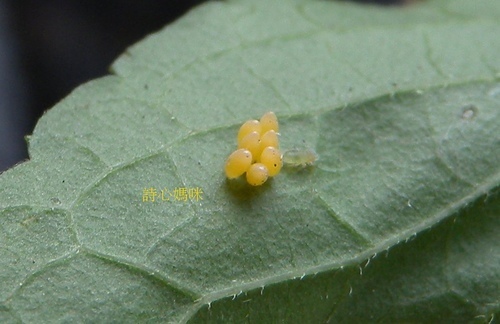 六條瓢蟲的卵,一般6-8顆置於葉背,以減少陽光曝曬及天敵吞食,增加存活的機率。