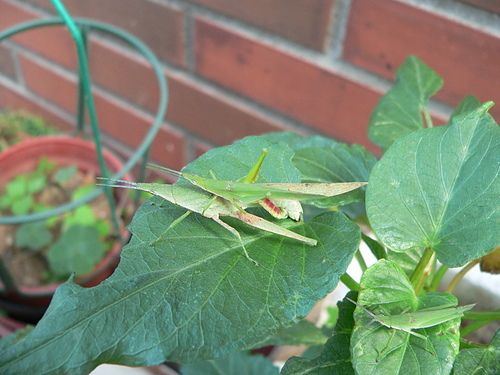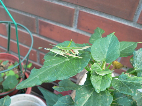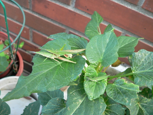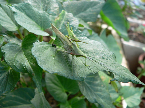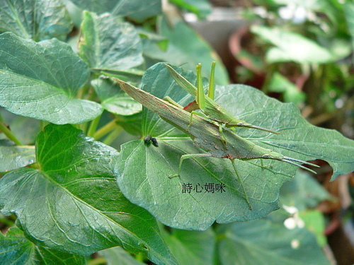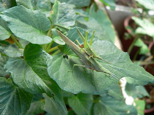 紅后負蝗雌、雄蟲體型大小差很多,以側身的方式交尾。