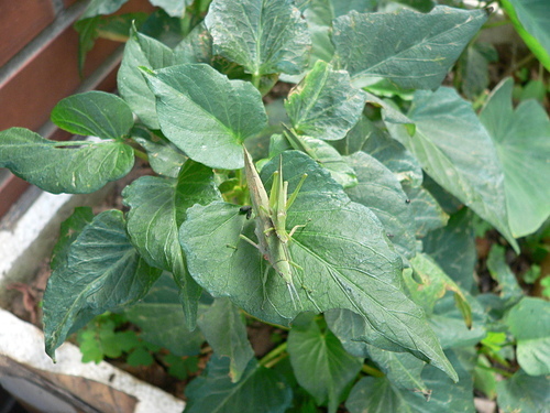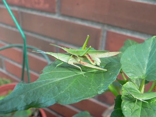 雄蟲體長 20 - 25 mm,雌蟲 34 - 42 mm,體色綠色或黃褐色,頭部尖長,觸角短,末端尖長在頭頂尖端,頭部側緣具顆粒狀斑點,口吻在下方,各腳顏色與體色同,後腳腿節較粗,翅狹長,超過腹端,翅端尖 。