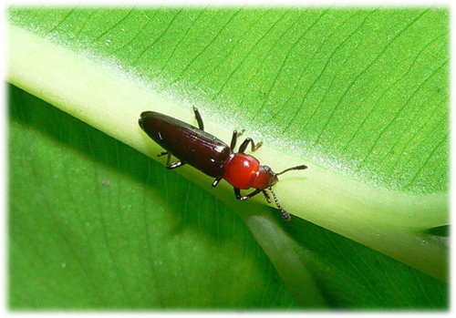 本種體型較小,體長只有4.3-5mm,頭部及前胸背板紅色具光澤,觸角黑色,後端漸粗,,各腳黑色。分布於低海拔山區。