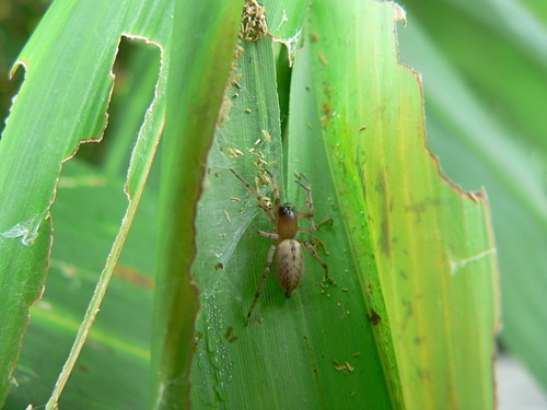 體長5mm,頭胸背板淡褐色,側具縱紋,腹背具較深褐斑,雄蛛觸肢細長,末端紅褐色,各腳黃褐色透明狀。分布於低海拔山區,常見棲息葉面或葉背,築薄絲為巢躲藏其中