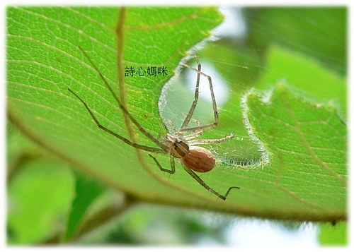 體長雌9-10mm,頭胸背板黃褐色,中央具1條白色的縱帶,縱帶中心尚有1條褐色的細線條紋,腹背板褐色,中央具白色的縱帶,縱帶前段有2條細褐色線紋至端部合為1條,未達腹末端。各處步足黃褐色具黑色的短毛。