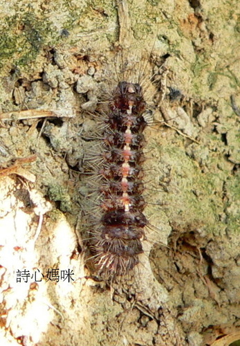 土塊下褐黑色背部有橘黃條紋的迷你毛蟲