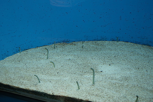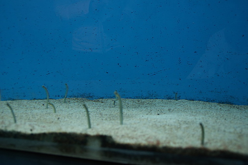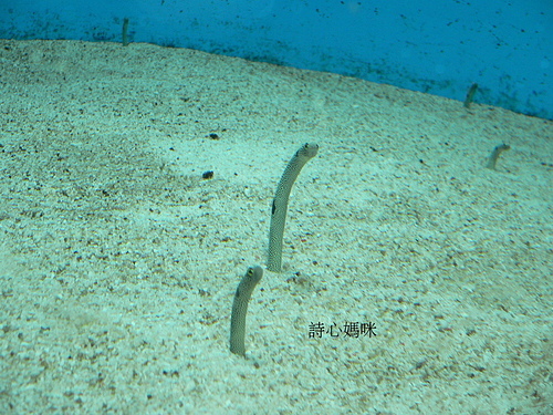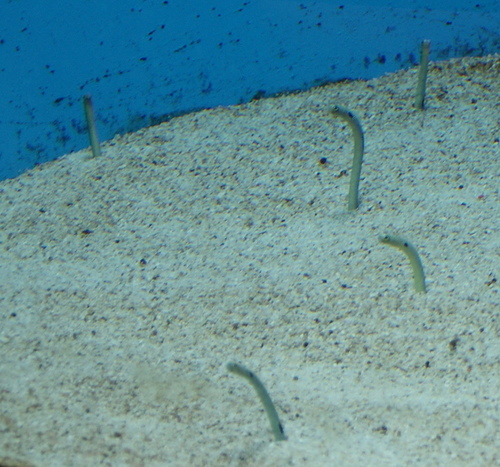 花園鰻很膽小,而且警戒心非常強,只要附近稍微有風吹草動,馬上會將身體縮回洞中,幾分鐘之後,會小心翼翼的探出頭來,張開那雙特大的眼睛東張西望,等到他確定安全後,才會慢慢的將身體伸出來繼續活動。 科俗名:Conger eels; Garden eels