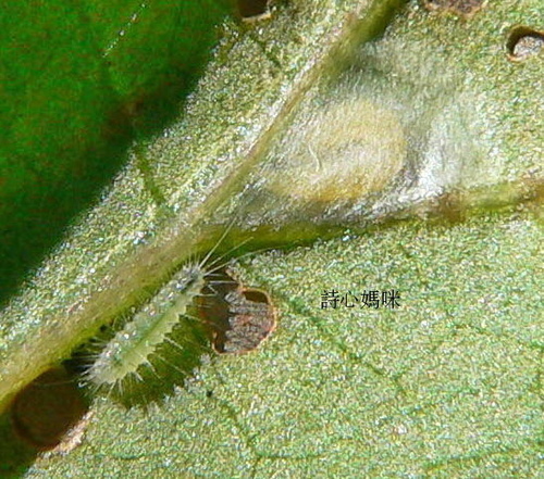 幼蟲共5齡,末齡幼蟲近老熟時暗綠色,體長10mm左右,各節上均生毛瘤,前胸、中胸、後胸節上各具4對,第1-8腹節上各有5對,瘤上生剛毛。蛹長10mm,頭端方平,體背各節上具2對毛瘤並有3 4個紫色斑點,全體蘋果綠色。