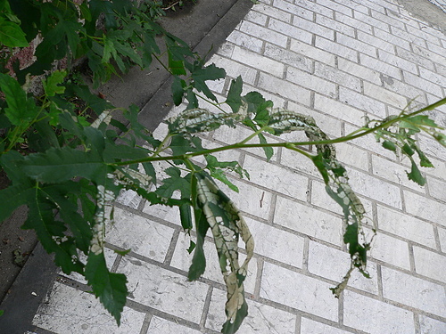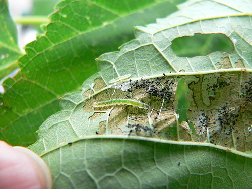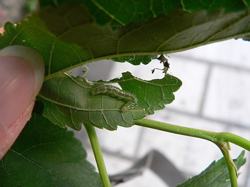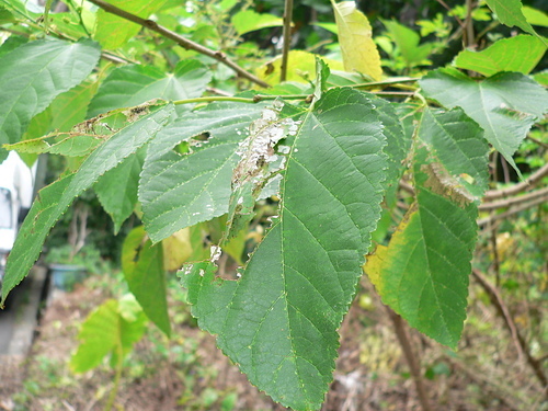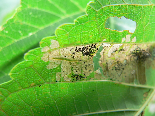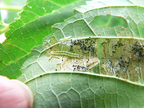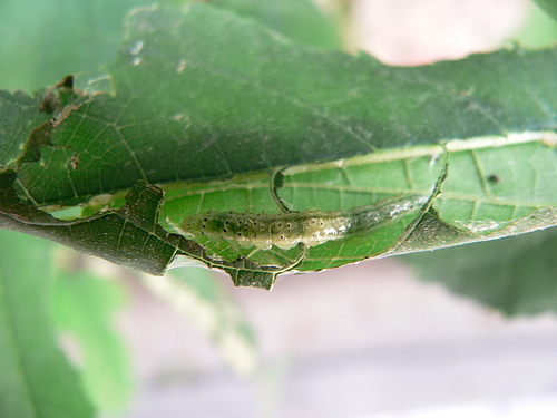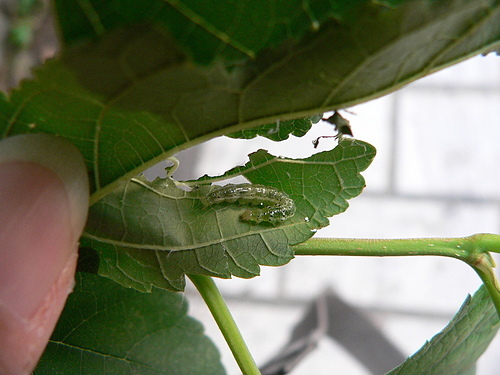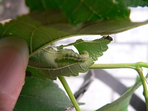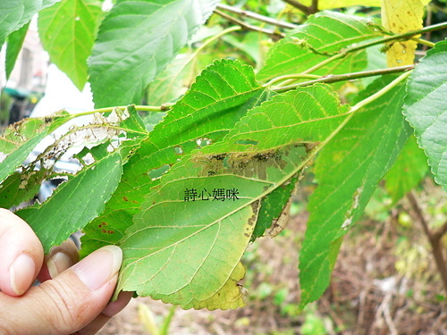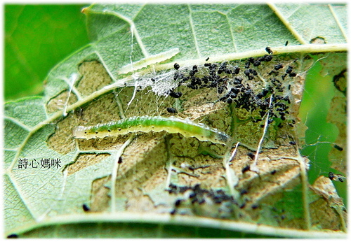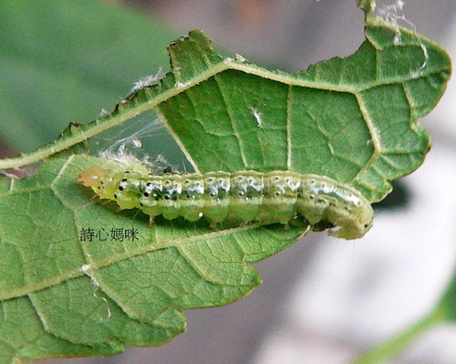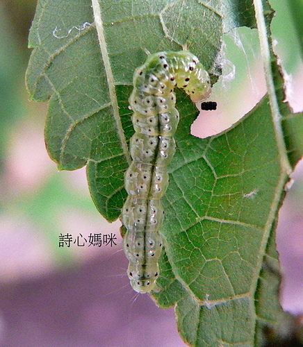 屋旁一枝椏上的桑葉幾乎被吃光,找到禍首是隻有多條白紋及許多小黑點的綠幼蟲。