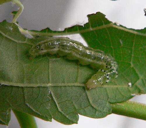 幼蟲綠色,亞背線為白色有光澤,為害瓜類、桑、葵等植物葉片,吐絲綴合葉片潛居葉間取食,常將葉片吃光只剩葉脈。