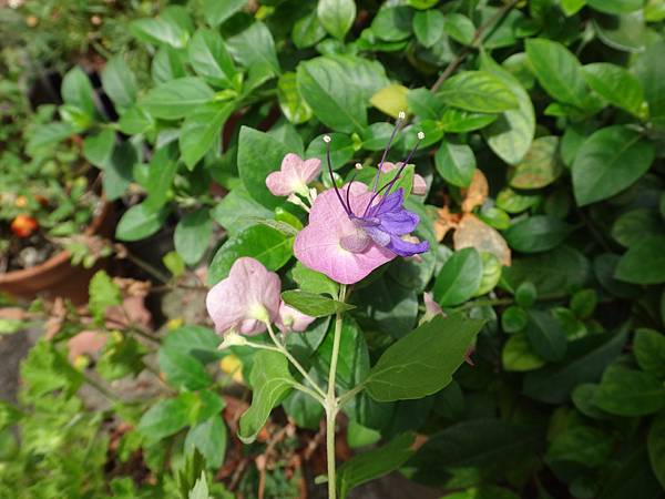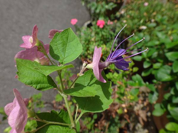 花萼粉紅色,脣形紫色花瓣,長花蕊