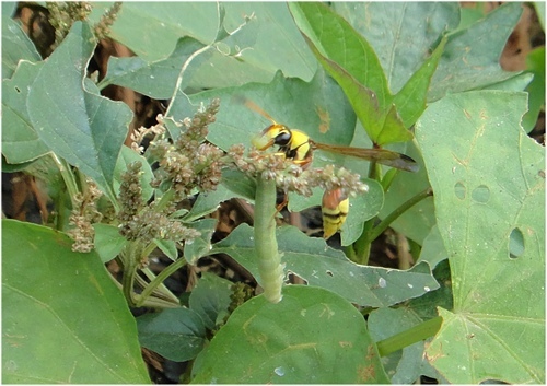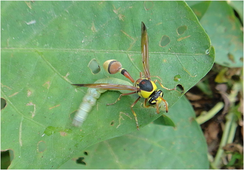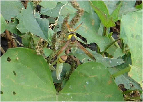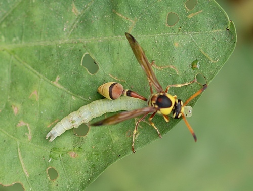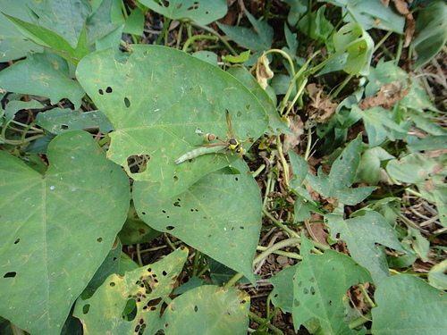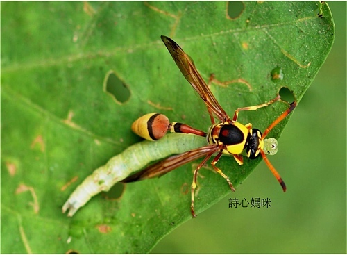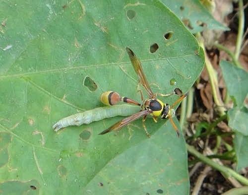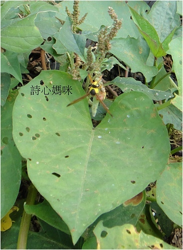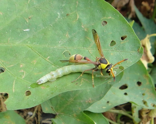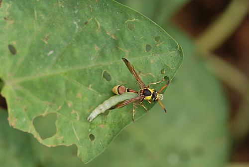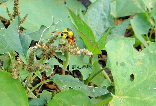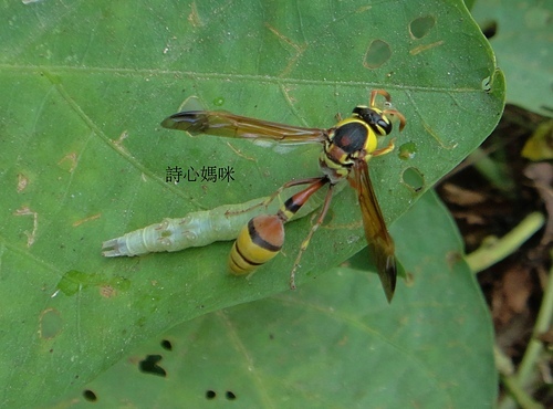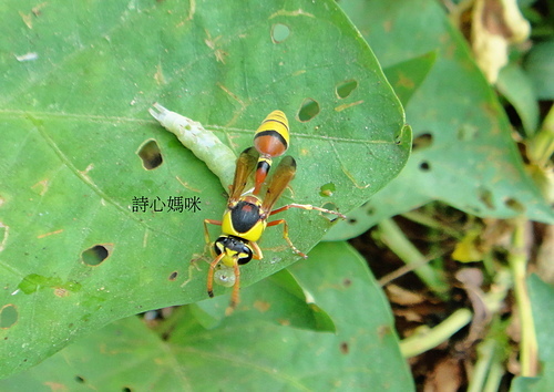 黃胸泥壺蜂在地瓜葉上補捉到一尾尺蠖蛾幼蟲,獵物還蠻重的,無法直接運載起飛。