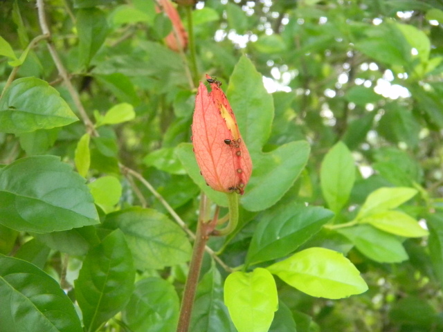 兩性花,花朵腋生,花朵朝上,花冠圓形;萼片成花瓣狀,橙紅色。