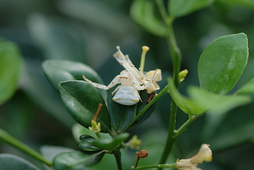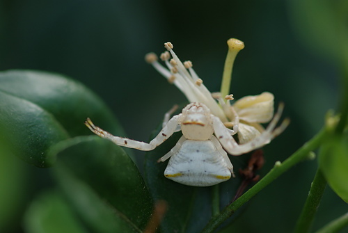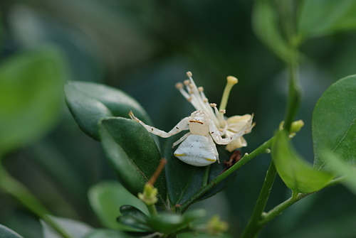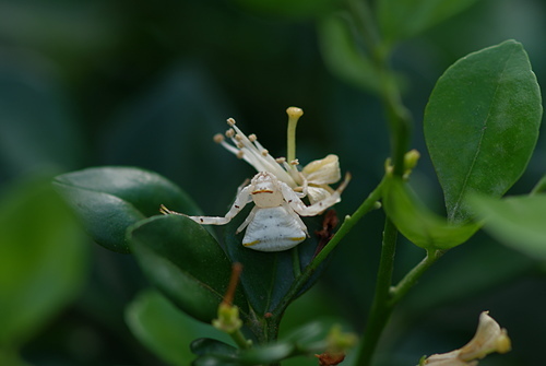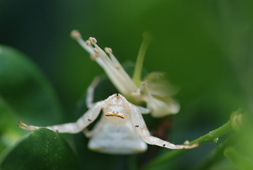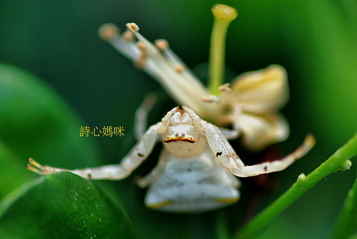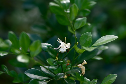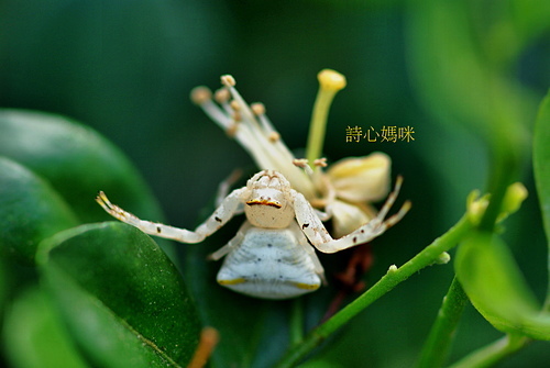 三角蟹蛛(雌)偽裝成七里香白花朵,向上天祈求: 賜給我食物吧!