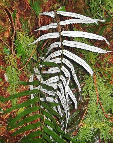 植株呈叢生狀,莖塊狀,短而直立,葉為一回羽狀複葉,葉背白色,頂羽片和側羽片同形,邊緣為銳鋸齒狀。營養葉長25~80公分,葉柄長5~30公分,基部膨大、具瘤狀突起之氣孔帶,基部橫切面為三角形、上段則為四角形。孢子葉40~120公分,具有由葉緣反捲所形成的假孢膜,故羽片看似線形。