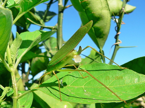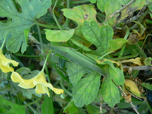 尖頭蚱蜢(雌蟲)與苦瓜花 96.10.23 &